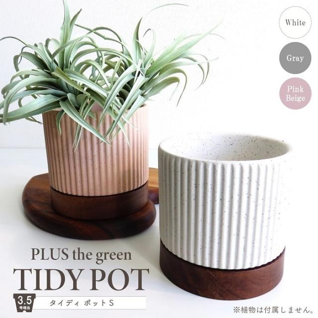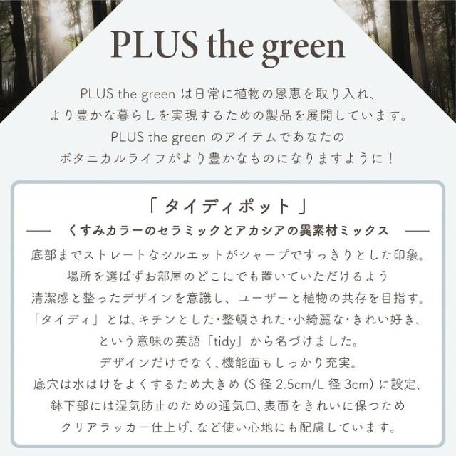 「タイディ」とは、キチンとした・整頓された・小綺麗な・きれい好き、という意味の英語「tidy」から名づけました。デザインだけでなく、機能面もしっかり充実。底穴は水はけをよくするため大きめ(S 径2.5cm/L 径3cm)に設定、鉢下部には湿気防止のための通気口、表面をきれいに保つためクリアラッカー仕上げ、など使い心地にも配慮しています。