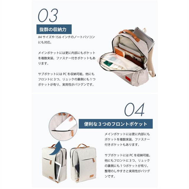 A4サイズや15.6インチのノートパソコンにも対応。メインポケットには更に内部にもポケットを複数実装。ファスナー付きポケットもあります。