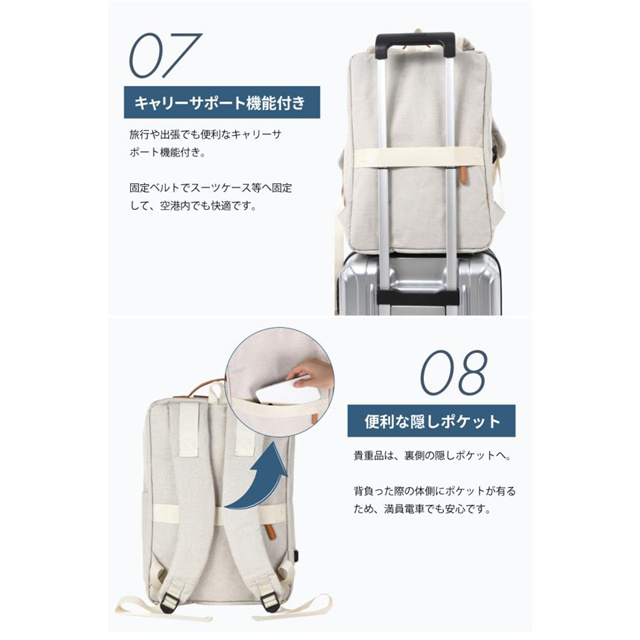旅行・出張時にも便利なキャリーサポート機能がついております。また機内持ち込みにも対応しており、旅行・出張にも便利なバッグパックです。