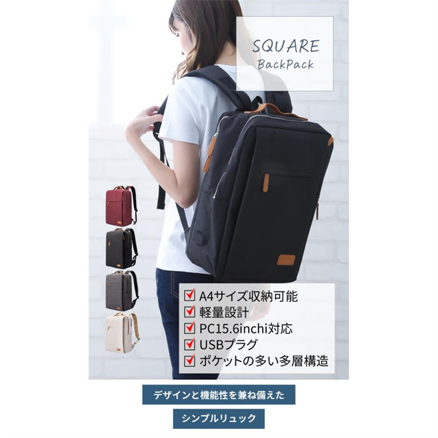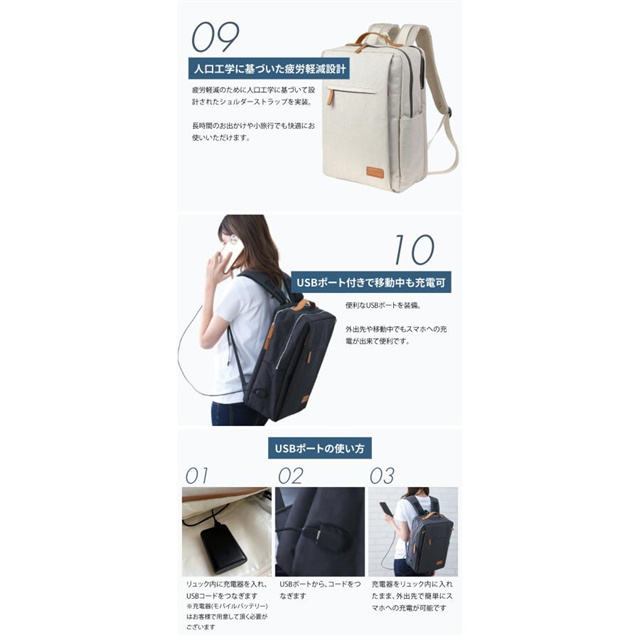 USBポートを備え、リュック内部にモバイルバッテリー(充電器)を入れてUSBコードをつなぐことで、外出先・出張先での充電が非常に便利です。