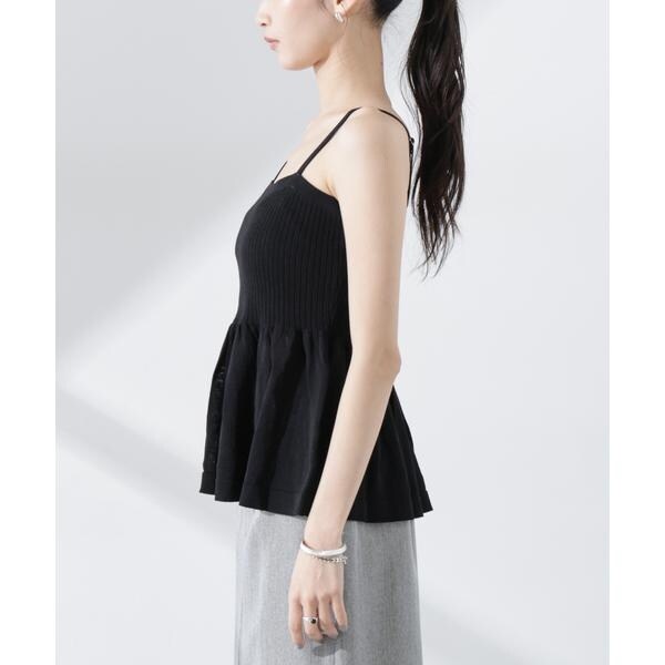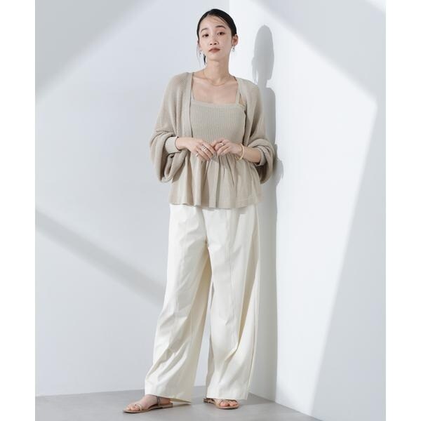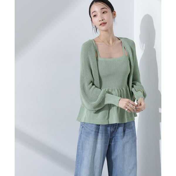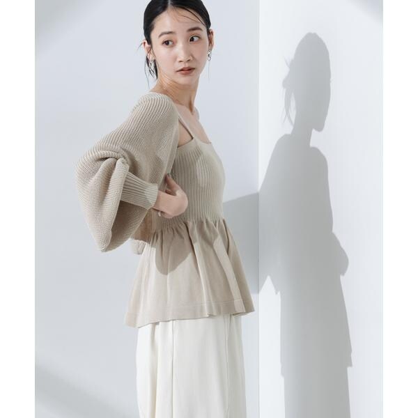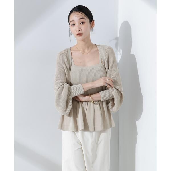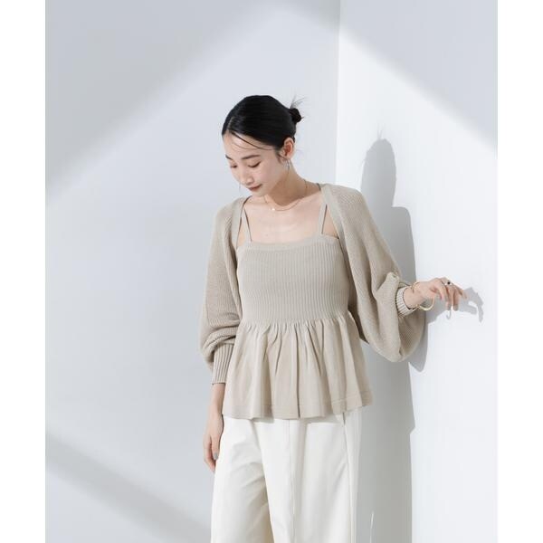 キャッチーなペプラムシルエットのキャミソールと、ショート丈ボレロのニットアンサンブル。セットで着用してトレンドスタイルが様になるだけでなく、それぞれ単品でも着回しやすく、コーディネートの幅が広がる万能アイテムです。