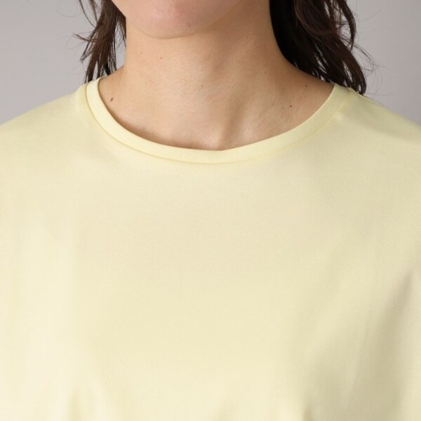 ワールド開発素材、アイスクリアコットンを使用しており、シルケット加工を施した糸をスムース組織に編む事で、綿100%でありながら接触冷感機能があり、さらりとした肌触りと光沢のある表面感が魅力です。
