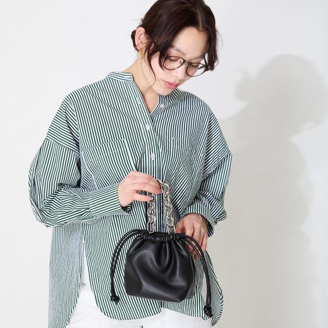 コロンとしたフォルムが可愛い巾着バッグは取り外し可能な太めのチェーンストラップで一気に雰囲気が変わるアイテム。本体と同色のショルダーストラップも付いているのでハンドバッグとしてだけではなく、肩掛けや斜め掛けも出来る優秀さも魅力。シンプルなデザインで季節問わず、どんなスタイルにも合わせやすい。【オススメPOINT】●取り外し・調節可能なショルダーストラップ付き●取り外し可能なチェーンストラップ付きサンプルにて撮影をしておりますので、中敷色、ロゴ色、裏地の色の仕様に変更がある場合がございます。あらかじめご了承ください。