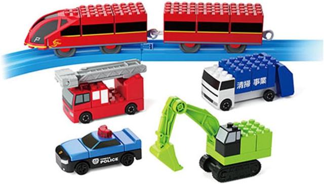 初めてでも簡単で、トミカやプラレールといっしょに遊べる楽しいブロックが登場! 5種類のはたらくのりものをキミの手で組み立てよう!