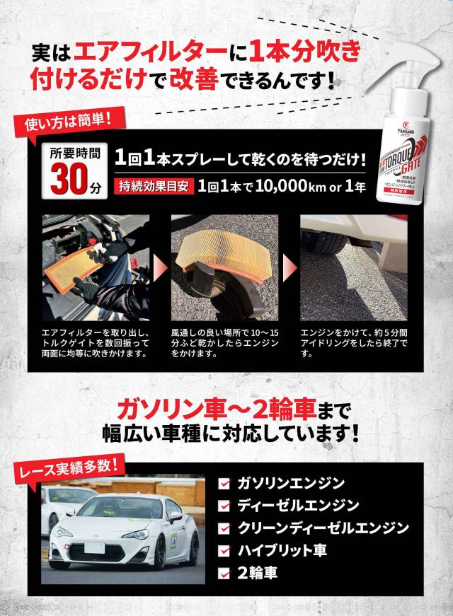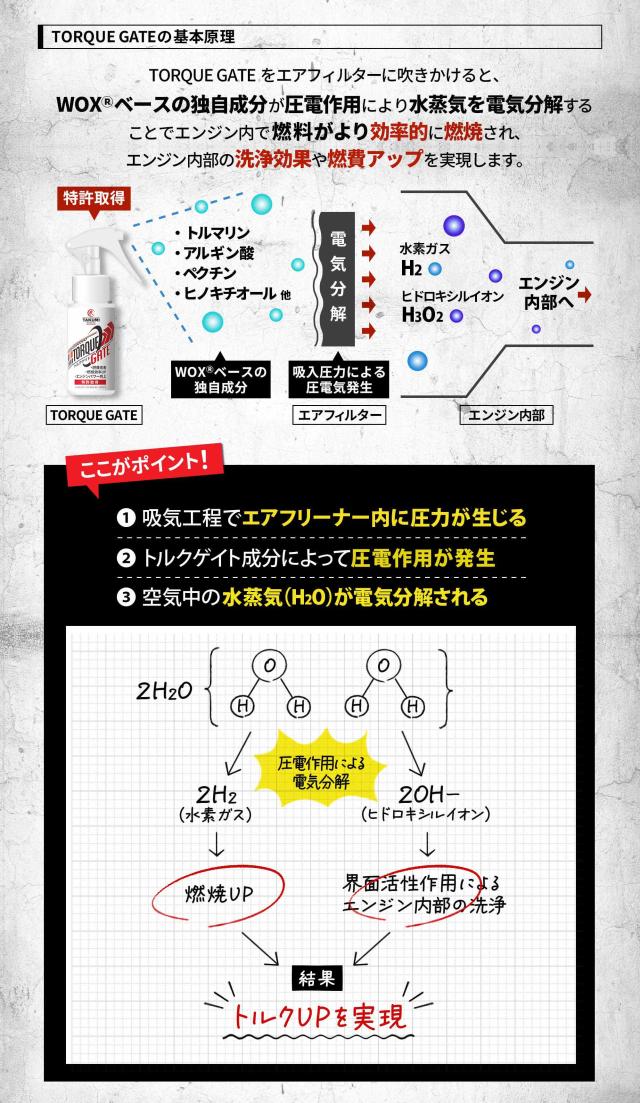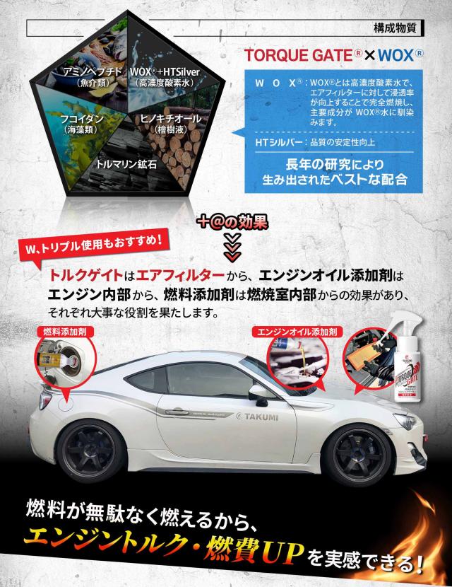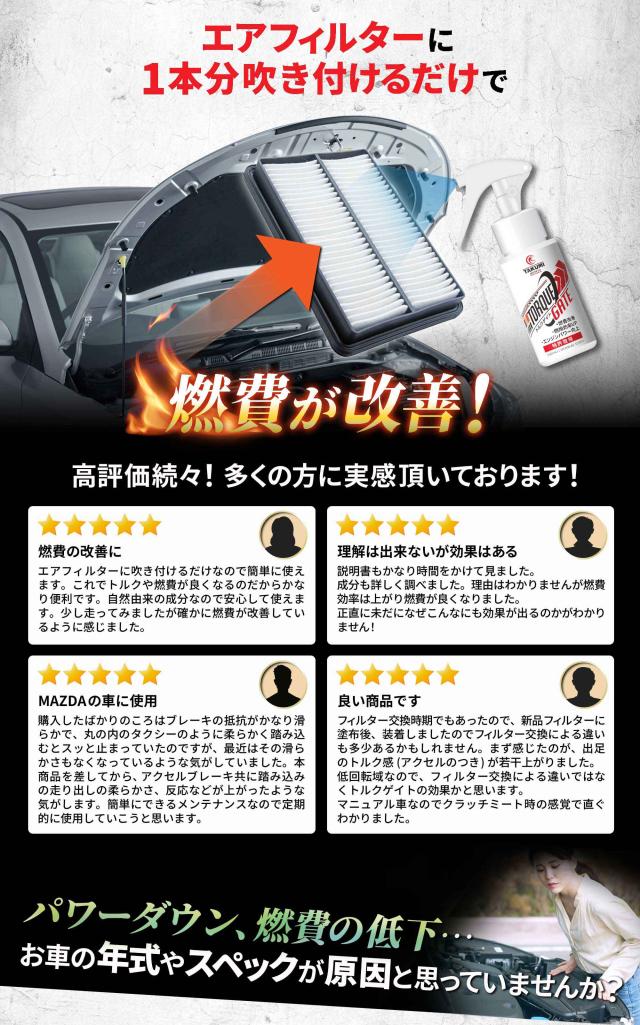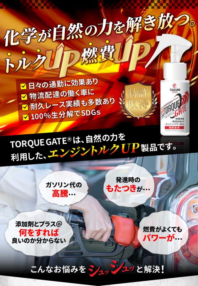 トルクゲイト トルクアップ 燃費改善 エアフィルター 燃焼効率改善 特許取得済み 自動車 二輪 自然由来の安全成分使用 効果実感 遅効性 トルクゲイト