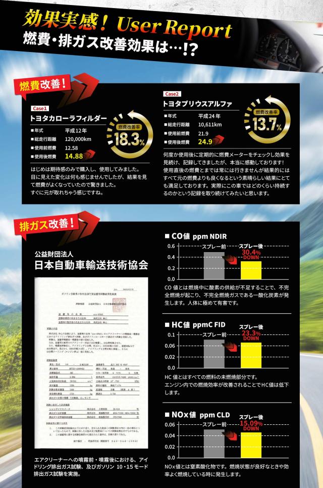 エンジン馬力トルクアップ 燃費改善 燃費向上 駆動性 始動性 エンジン音低減 加速 潤滑性 冷却性能 清浄性 防腐性 気密性 熱安定性 オイル下がり オイル上がり 摩擦低減 カーボン除去 スラッジ防止 エンジンオイル寿命 ガソリンエンジン ディーゼルエンジン ハイブリッド ターボエンジン