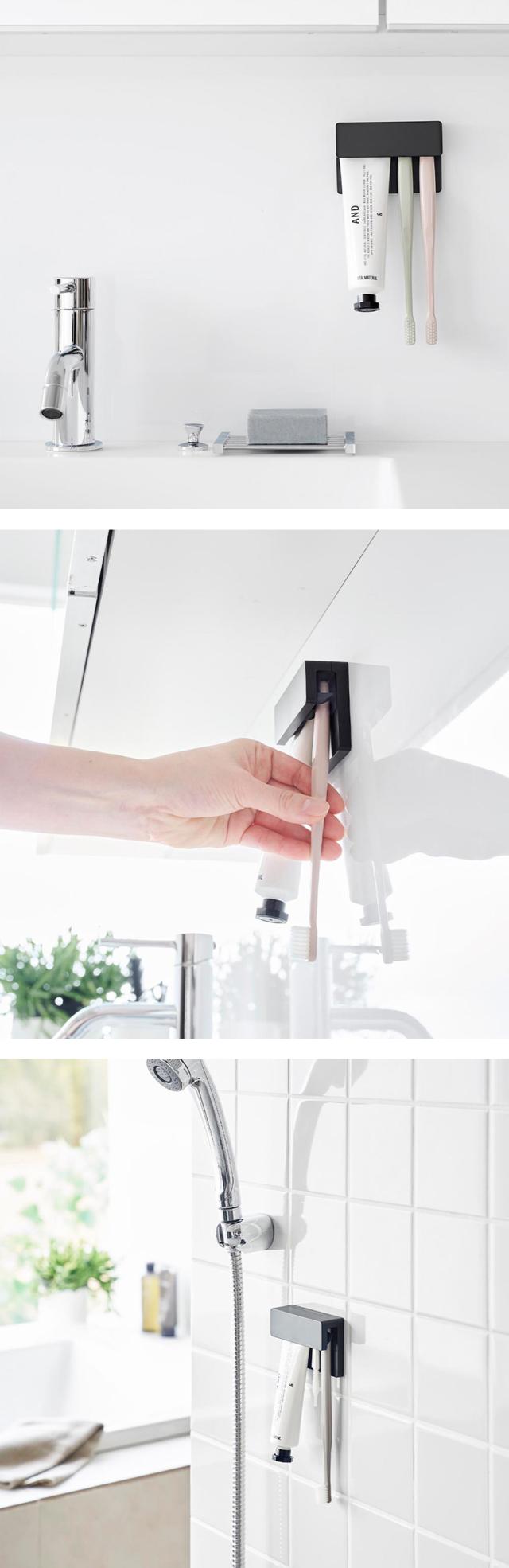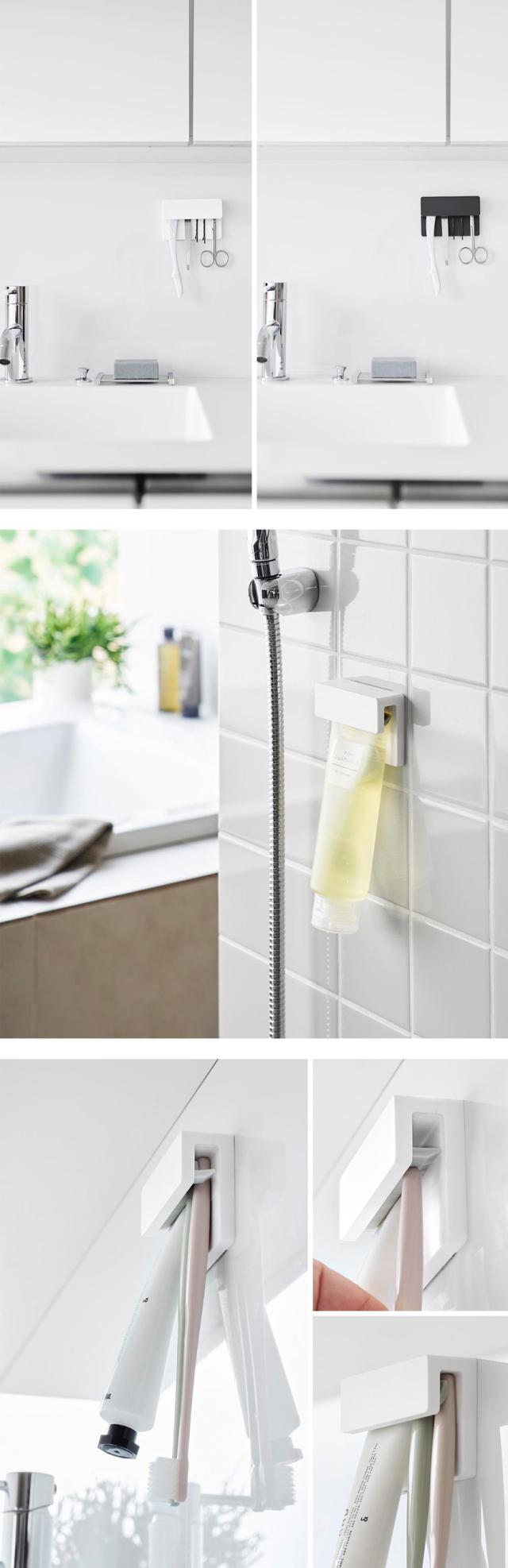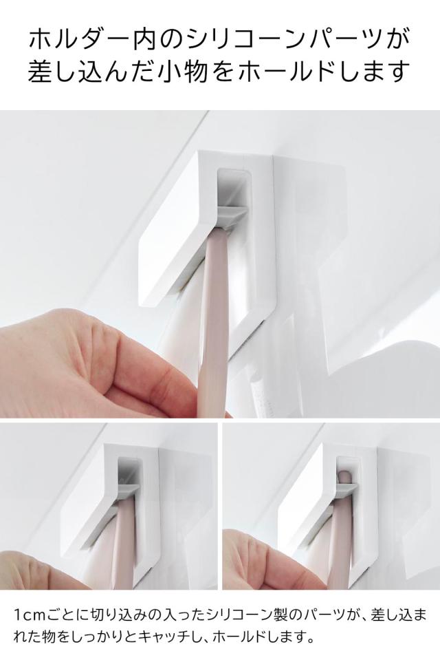 歯ブラシや歯磨き粉、洗顔フォームなどの小物を浮かせて収納できる、2個セットのホルダーです。フィルムフックで洗面パネルやお風呂のタイルなどのお好みの位置に簡単に設置できます。収納したい物を下からスッと差し込むだけで、ホルダー内部にある切り込みの入ったシリコーンパーツがしっかりとホールドします。浮かせて収納できるので風通しも良好!濡れた歯ブラシのヘッドも、下向きにしてどこにも触れることなく収納できるので、乾きやすく衛生的です。厚みが2〜8.5mmの物であれば収納できるので、歯間ブラシやピンセットのような小さな物も収納可能です。浮かせているので場所を取らず、周辺のお掃除の際にも邪魔にならず快適です。