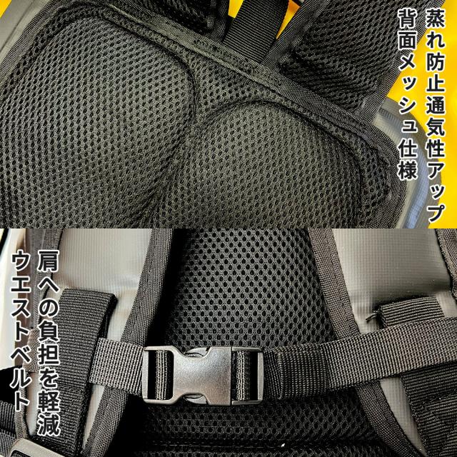 蒸れを抑えるメッシュ仕様。肩への負担を軽減するウエストベルト付きで重い荷物も安定
