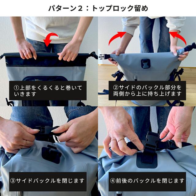 バッグの開閉方法は2種類。サイドロック留めは荷物をたっぷり入れたい時、トップロック留めは内容量が少ない時や、日常シーンにおすすめ