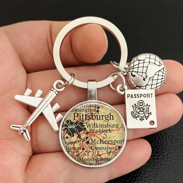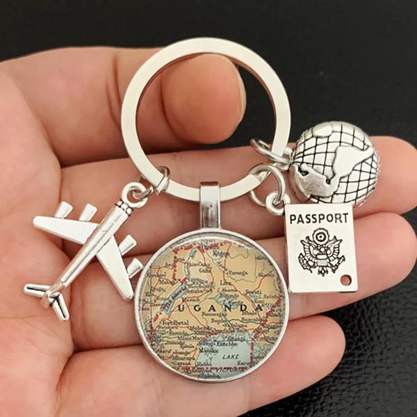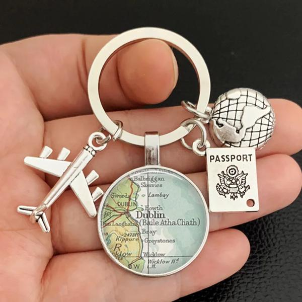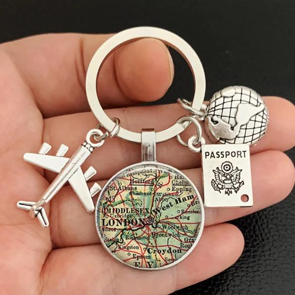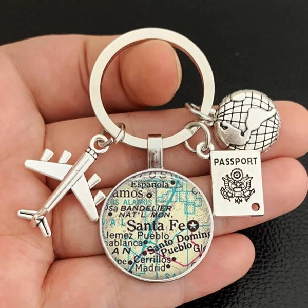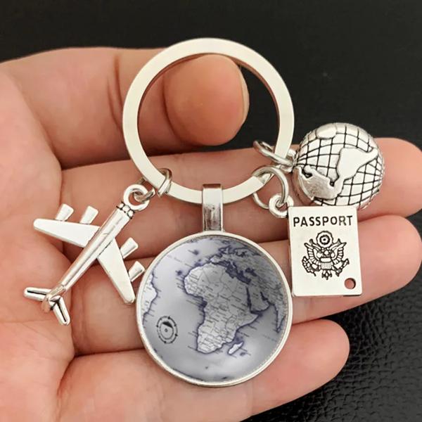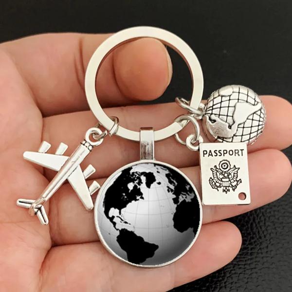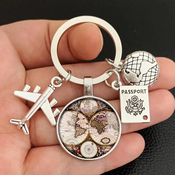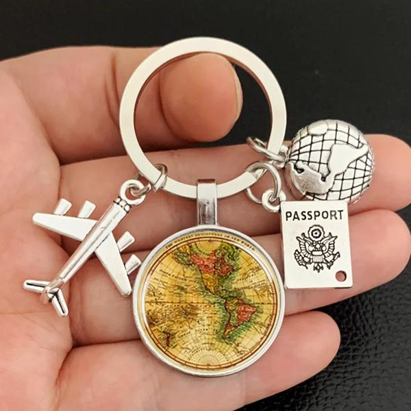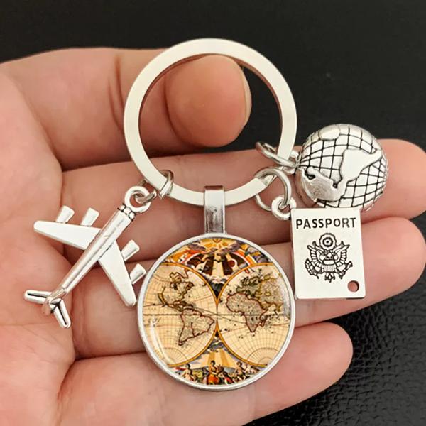 世界地図キーホルダー旅行探索ガラスドーム面飛行機チャームペンダントキーホルダー男性と女性のギフトジュエリーキーホルダー。
