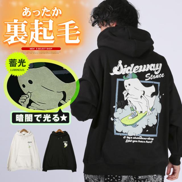 パーカー スウェット フーディ— プルパーカー メンズ 長袖 暖か あったか 裏起毛 蓄光【裏起毛ゴースト発泡プリントパーカー】 aa-3456