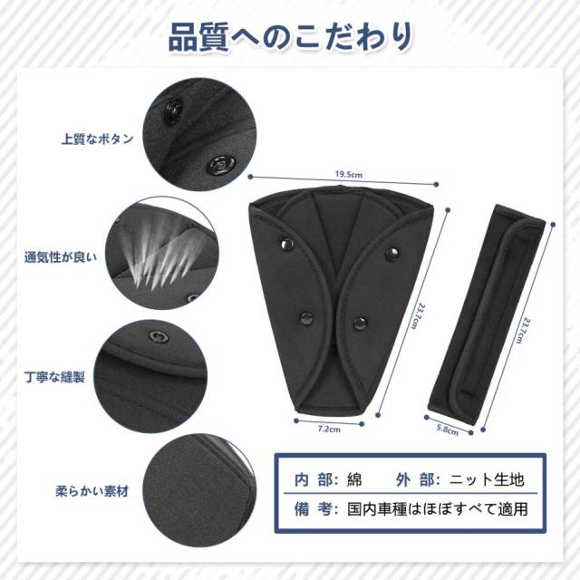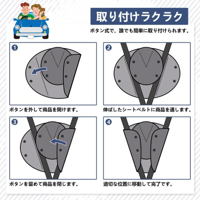 簡単装着: ボタン式のデザインで、取り付けも外しも簡単です。車のシートベルトに合わせてサイズ調整が可能です。