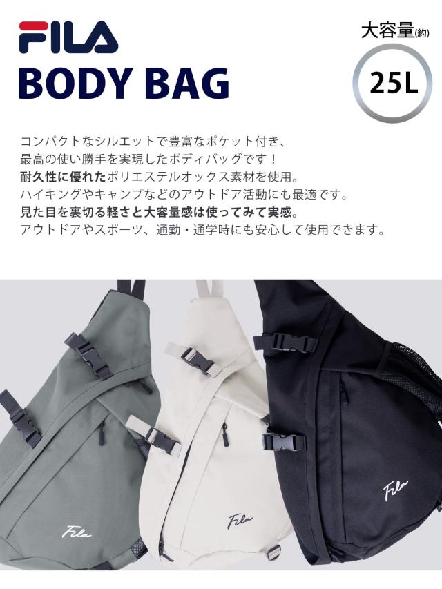 【一部予約】FILA フィラ ボディバッグ スリングバッグ メンズ レディース ブランド 大容量 25L 軽量 多収納 ショルダーバッグ 斜め掛け 肩掛け メッセンジャーバッグ ワンショルダーバッグ かばん 大きめ 通勤 通学 プレゼント outfit 2025ss