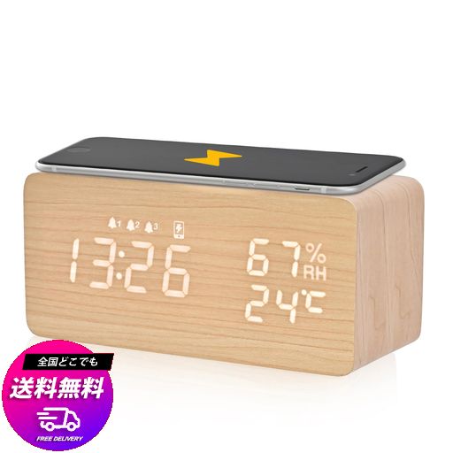 ELECTIME 目覚まし時計 置き時計 スマホ充電 デジタル 多機能 木目 卓上 QIワイヤレス充電器 温度/湿度/アラーム 自動輝度調節 自動調光 おしゃれ USB給電 アラームクロック 技適認証/QI認証 (…