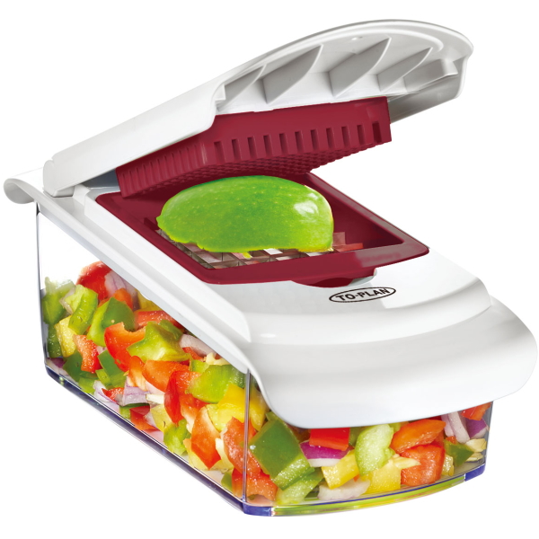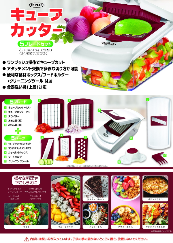 ワンタッチで大きさの揃ったキューブカット&みじん切りができる!さいの目、スライス、細切り、挽く、おろす、皮をむくなど。5種類のブレードアタッチメントで、あらゆる種類の果物や野菜を必要な形とサイズにカット。●食材をセットして、フタを閉じるだけで、一瞬でキューブ状にカット!●切れ味するどい丈夫な格子状の刃と、計算された本体の角度によって、硬い食材も楽々カット!●目の大きさの違う2種類の角切り用の格子刃で、煮物用からみじん切りまで瞬時に賽の目に切ることができます。●アタッチメントを変えれば、すりおろし、スライス、細切り、千切りも!●手間のかかる果物や野菜の下ごしらえはお任せください!●鮮やかにカットされた色とりどりの野菜で、食卓まで華やかに♪たくさんの野菜や果物で、ヘルシーな毎日を!●食洗器でカンタンに洗うことができ、使い終わったら全てを容器に入れてスッキリ収納。