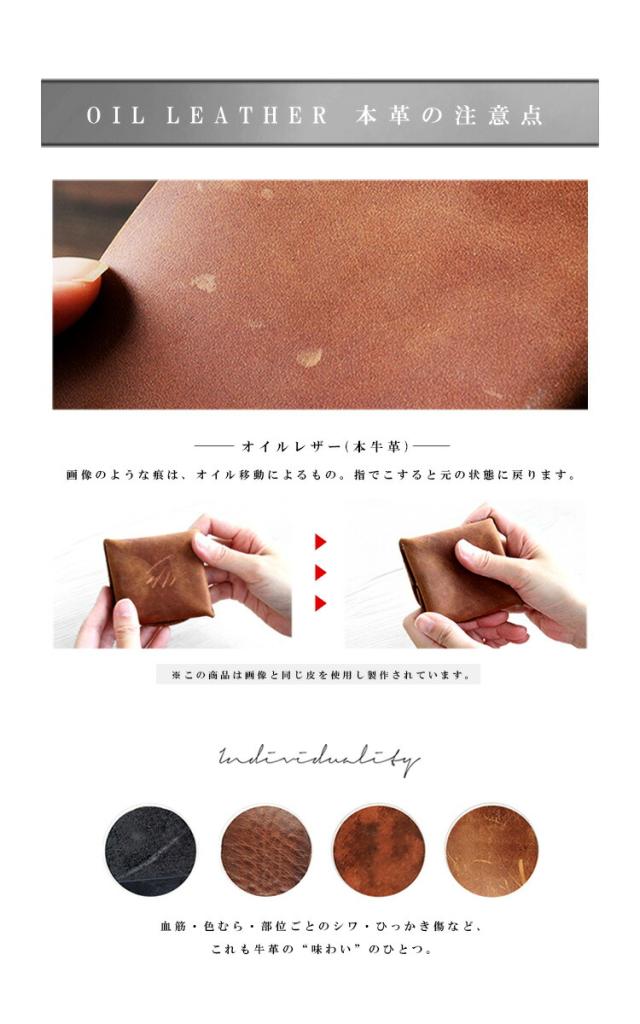 ※ヴィンテージ加工のオイルレザーのため素材の特性としてシワ、傷、汚れなどがある場合がございます。