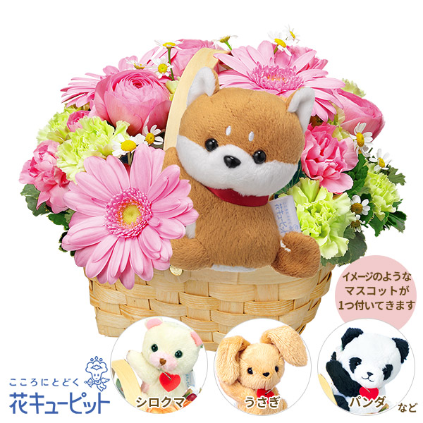 ピンクガーベラを中心に、春らしく仕上げたアレンジメントです。バスケットのハンドルには、可愛らしい動物のマスコットを添えました。マスコットは、パンダ・三毛猫・うさぎなどの豊富なラインナップから1つお付けいたします。どのマスコットが届くかはお楽しみ!