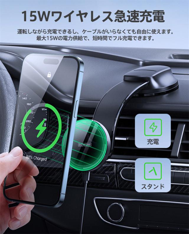 車載ホルダー ワイヤレス充電器 スマホ充電器 吸盤 真空吸着 最大15W出力 急速充電 スマホスタンド 置くだけ 角度調整 iph