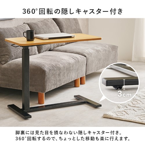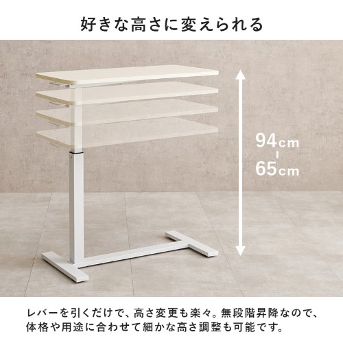 | 【商品紹介】 ガス圧式で無段階に高さ調節ができる昇降テーブル。キャスター付きで移動がしやすく、ソファやベッドに座って作業するときも脚が邪魔にならないデザインです |