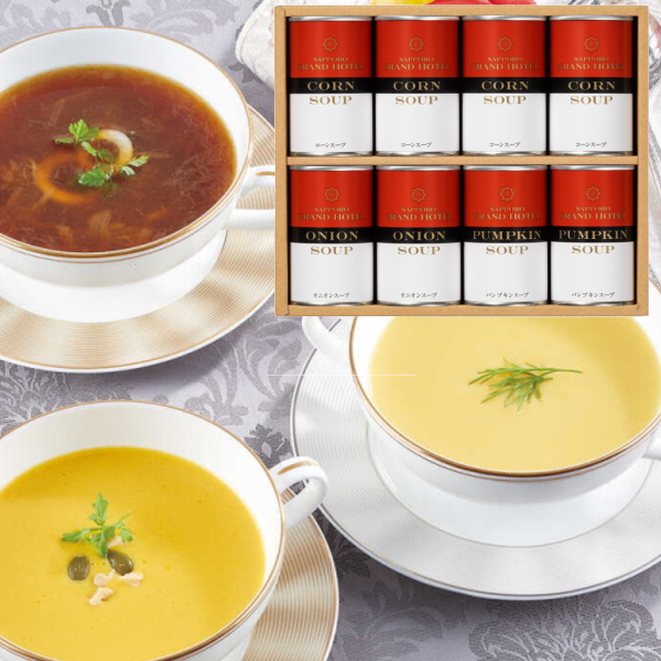 札幌グランドホテル スープ缶詰詰合せ 8缶 SCA-40 長年愛され続けている、スープ、北海道産、とうもろこし、牛乳、生クリーム、詰合せ、えびす南瓜、パンプキンスープ、オニオンスープ