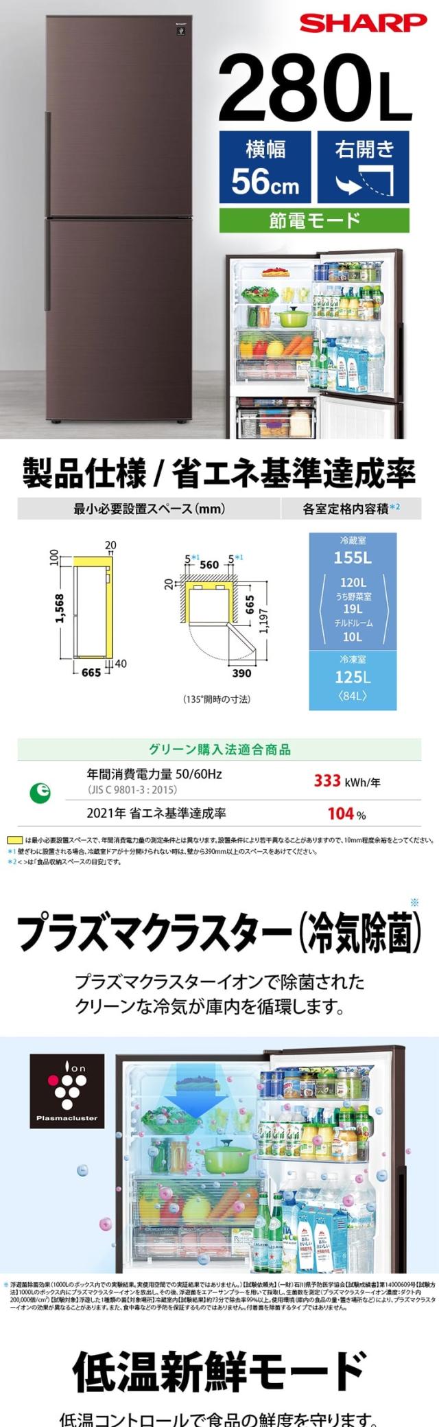 冷蔵庫 280L 右開き SJ-PD28P-T アコールブラウン