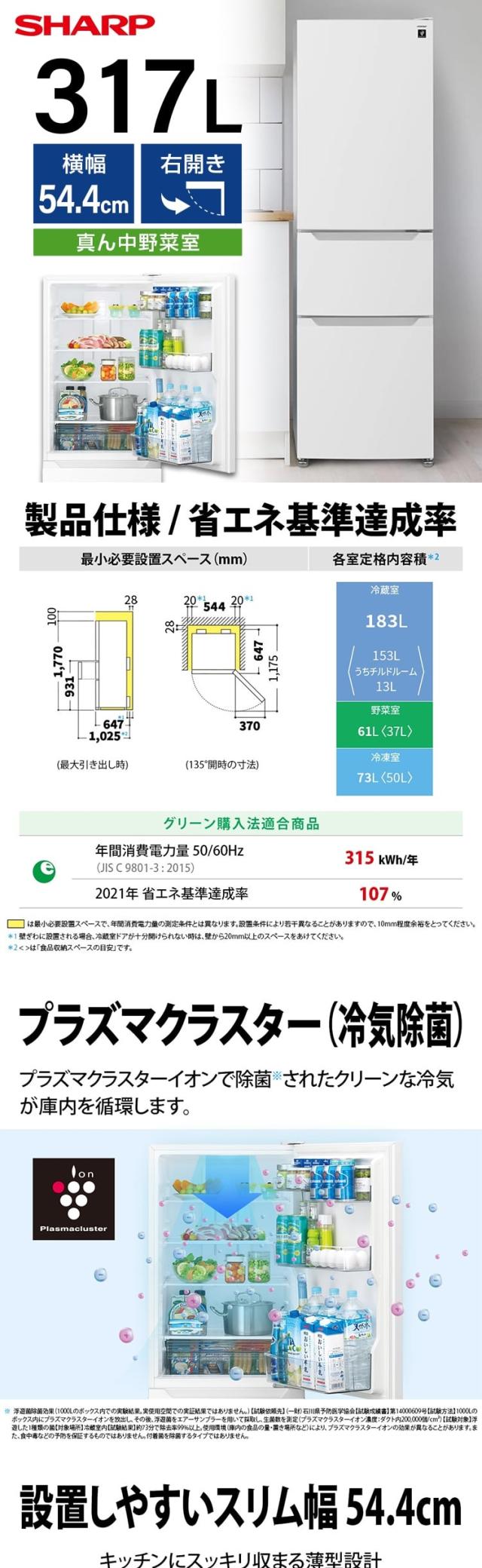 冷蔵庫 317L 右開き SJ-PT32P-W マットホワイト