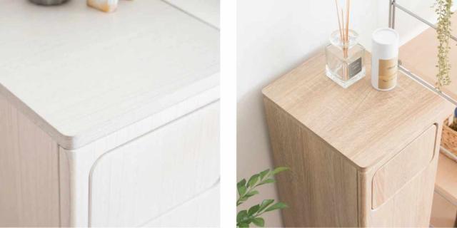 天板がフラットになっているため、キッチン雑貨や観葉植物、ディフューザーなどのちょっとした小物が置けます。天板や扉の角はケガをしないように丸く加工されているので、安心安全です。