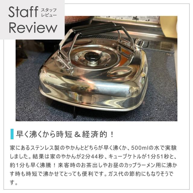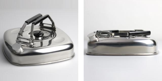 丈夫でサビにくいステンレス製のキューブケトルです。ケトルは本来、持ち手が1本ですが、キューブケトルは持ち手が2本あります。持ち手を立てた高さ10.5cm、持ち手を畳んだ高さ7cmと、薄型なのがポイントです。