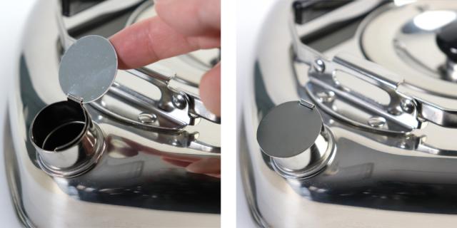 注ぎ口に蓋が付いているので、冷めにくいです。また、アウトドアの使用時には、焚き火中の灰やゴミが入るのを防ぎます。
