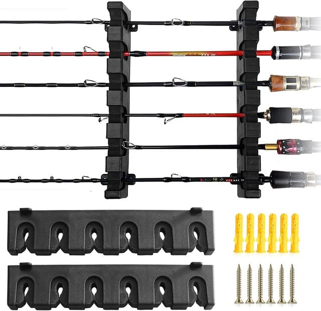 【壁掛けホルダー】 ロッドが6本収納できる壁掛け ロッドスタンド。釣り竿は水平に、釣り竿は垂直に配置できるので、安定していて緩みがなく、スペースを節約できます。ロッドの取り付けと取り外しが便利です。