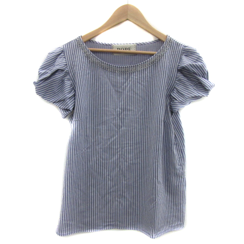 【中古】ロペ ブラウス カットソー 半袖 パフスリーブ ストライプ柄 ビーズ 大きいサイズ EX-2 XL 水色 レディース