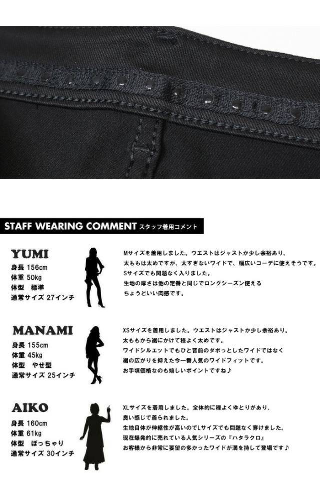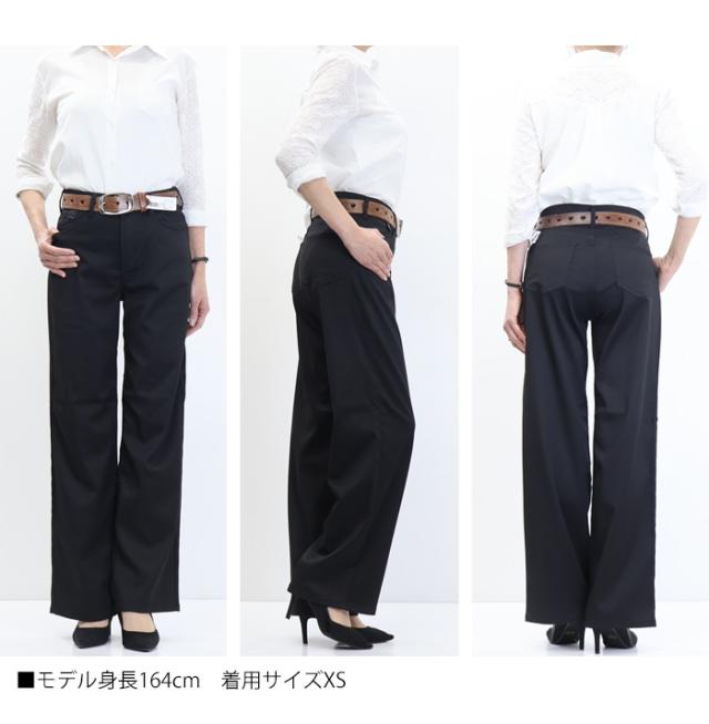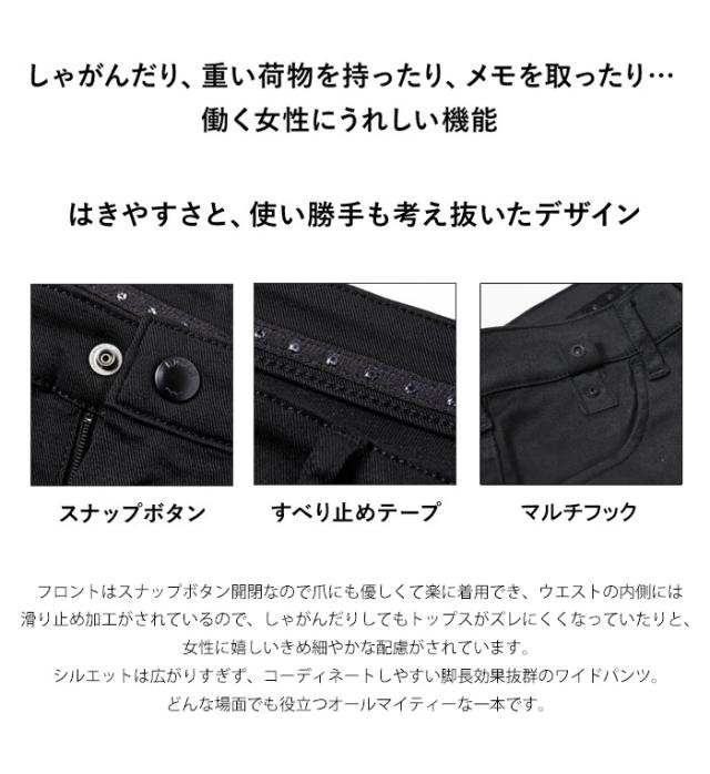 シルエットは広がりすぎず、コーディネートしやすい脚長効果抜群のワイドパンツ。どんな場面でも役立つオールマイティーな一本です。フロントはスナップボタン開閉なので爪にも優しくて楽に着用でき、ウエストの内側には滑り止め加工がされているので、しゃがんだりしてもトップスがズレにくくなっていたりと、女性に嬉しいきめ細やかな配慮がされています。