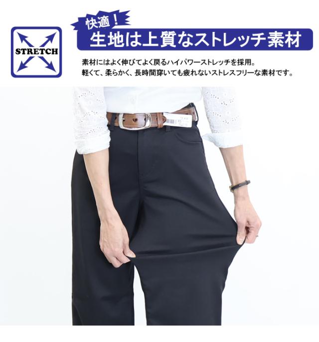 仕事用としても穿ける黒パンツは「ほこりが付くと目立つ」「毎日穿いているとすぐ色が褪せてしまう」 という悩みを解決してくれるパンツです。ストレッチ性が高く、しっかりした綿タッチ素材です。 ポリエステルとレーヨン混紡原着糸(通常は紡糸した後に染色しますが、綿段階から染める)を使っているためホコリがつきにくく、色褪せしにくい素材です。