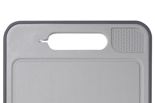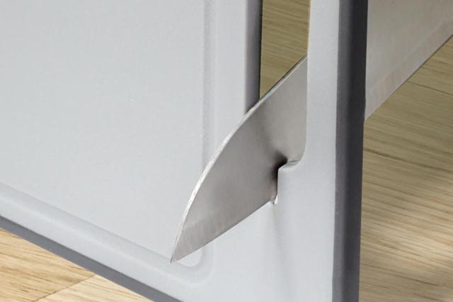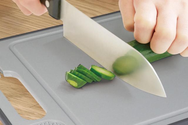 食材から出た水分が溝に留まり、調理台が汚れるのを防ぎます。フチは滑り止めにもなっているので安定してカットできます。