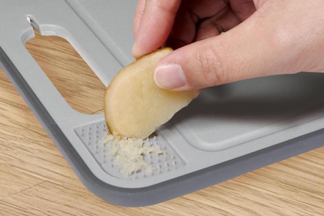 薬味をカットしたまな板の角でおろしが可能。しょうがやニンニクなど少しだけ、おろしたい時に便利です。