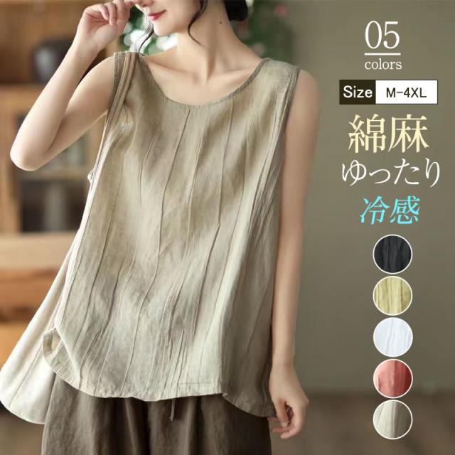 タンクトップ レディース ノースリーブ トップス 綿麻 リネン 袖なし Tシャツ ゆったり 薄手 重ね着 体型カバー カジュアル
