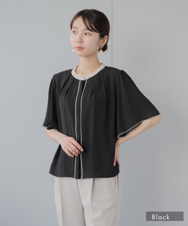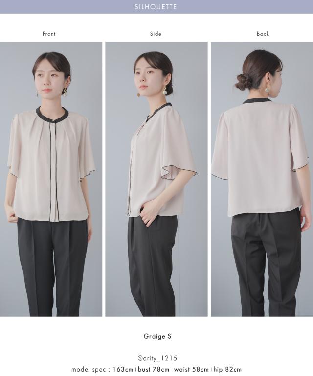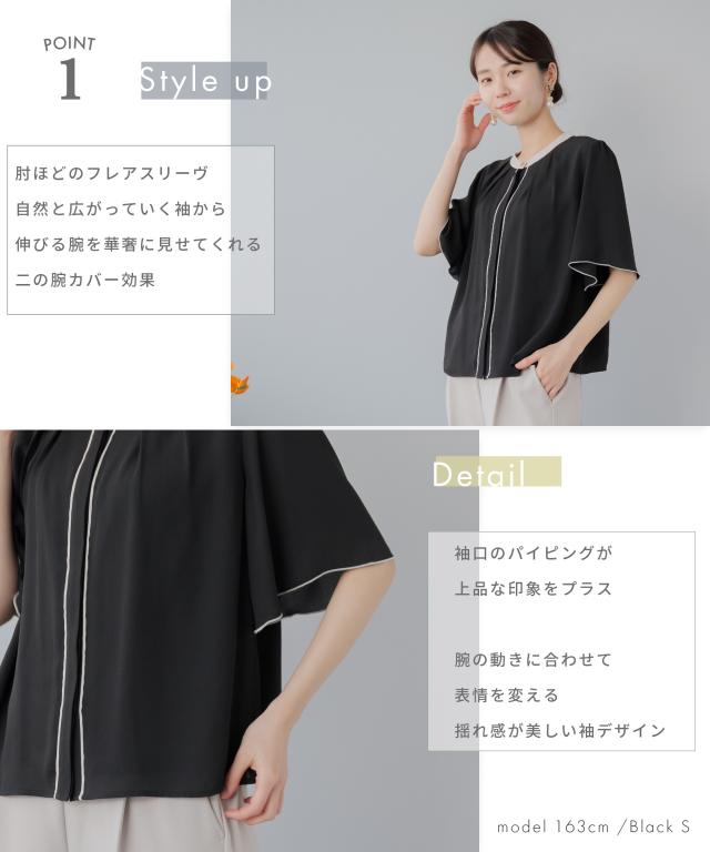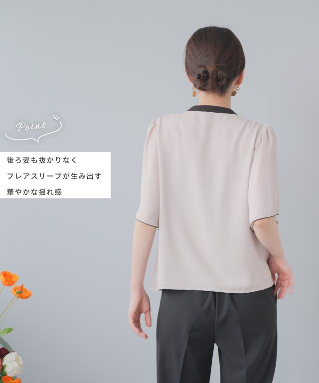 目を惹く配色デザイン&ゴールドボタン。フレア袖が二の腕カバーも叶えるキレイめブラウス。肘ほどのフレアスリーブ。自然と広がっていく袖から伸びる腕を華奢に見せてくれる二の腕カバー効果。袖口のパイピングが上品な印象をプラス。腕の動きに合わせて表情を変える揺れ感が美しい袖デザイン。後ろ姿も抜かりなく。フレアスリーヴが生み出す華やかな揺れ感。ブラウスの裏地はストレッチ性が高い、さらっとした素材感のカットソー素材。Tシャツのようなラクな着心地。カットソー裏地とジョーゼットの2枚仕立て。裏地と表地の色を合わせることで、透けにくさをアップしました。タックインもタックアウトもジャケットを羽織ってもキレイにまとまる程よい着丈。キーワード:ビジネス 通勤 オフィス 夏 春 透けない セレモニー おしゃれ 20代 30代 40代 50代 大人カジュアル Festinalente フェスティナレンテ カフス 七分袖 半袖