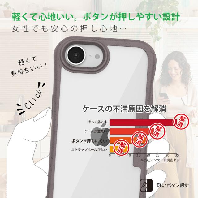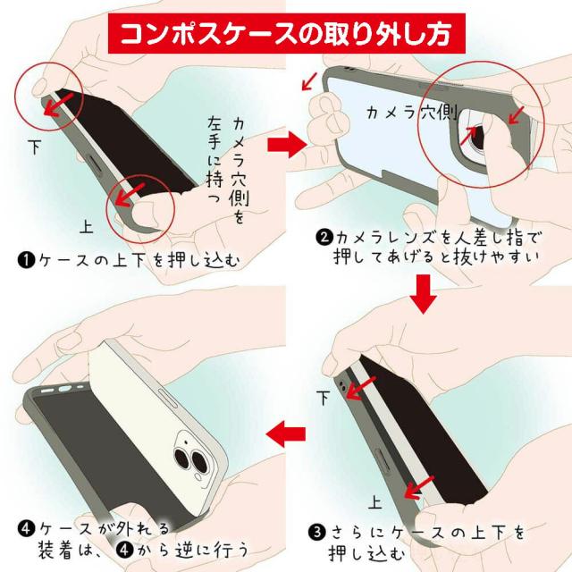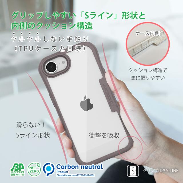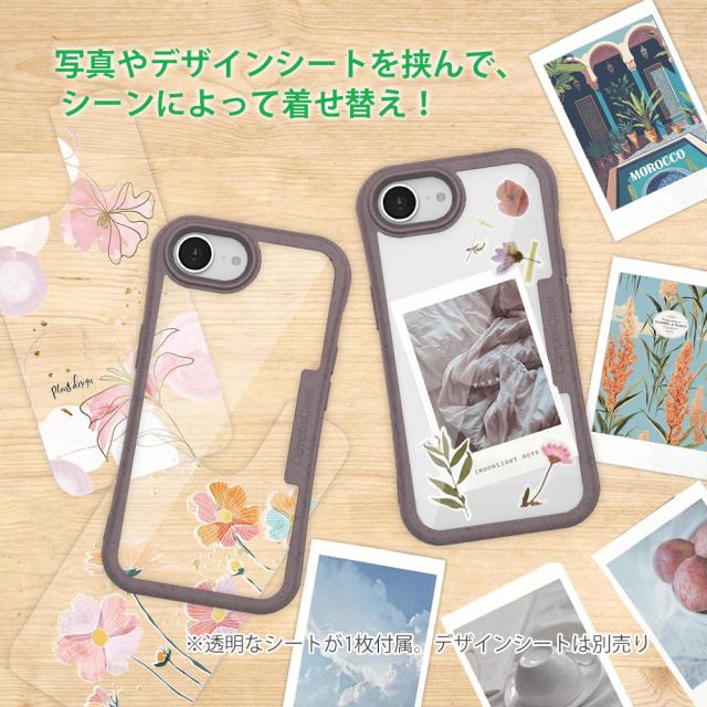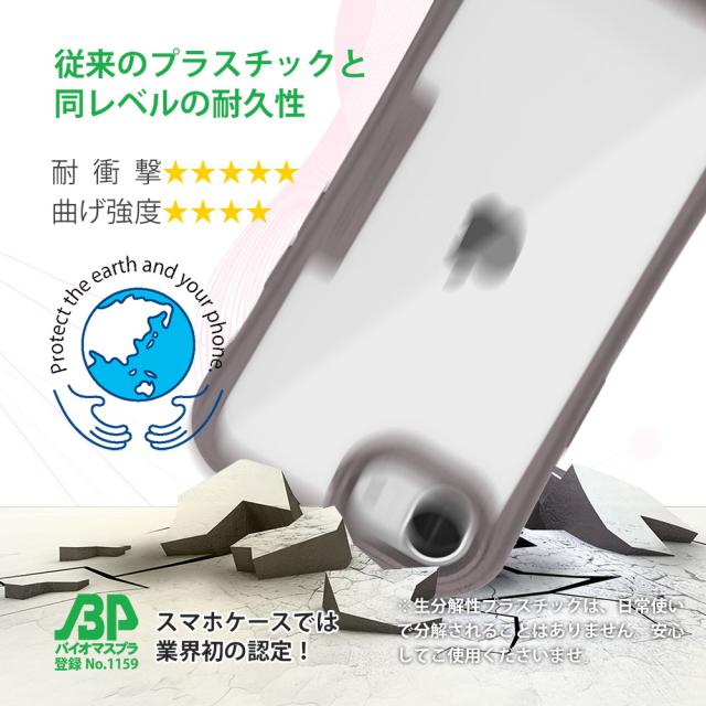 | ケースについて | 背面の内側に入れ込むデザインシートで、シーンに合わせて着せ替え可能。また、グリップしやすいクッション構造で、本体重量は37gと軽減化を実現。さらに衝撃に強いSライン形状、究極に押しやすいボタン設計(切り込みが入ることで押し込む力を軽減)、背面のカメラ・レンズを保護する高さ設計となっております。生分解性プラスチック素材ながらも着脱もしやすく、割れない・指紋防止加工を施しています。 |