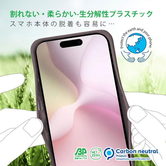 | 注意事項 | 側面部分(カラーが付いたフレーム部分)は、環境に優しい「持続性可能な生分解性プラスチック」素材で生成されております。この素材は、普通のプラスチックやTPU素材とは違い、どうしても傷が付きやすいという特性が否めません(それでも生分解性プラスチックをスマホケースの形状にするには非常に高度な技術を要します)。予めご了承くださいませ。 背面の再生プラスチックは厚さ約2mmなので、Qi充電にも対応していますが、装着していない時に比べると、若干充電速度は落ちる可能性があります。 |