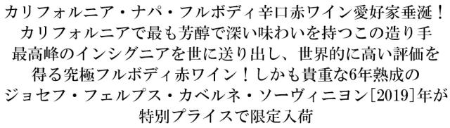 カリフォルニア・ナパ・フルボディ辛口赤ワイン愛好家垂涎!カリフォルニアで最も芳醇で深い味わいを持つこの造り手最高峰のインシグニアを世に送り出し、世界的に高い評価を得る究極フルボディ赤ワイン!しかも貴重な6年熟成のジョセフ・フェルプス・カベルネ・ソーヴィニヨン[2019]年が特別プライスで限定入荷