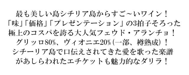 最も美しい島シチリア島からすごいワイン! 「味」「価格」「プレゼンテーション」の3拍子そろった 極上のコスパを誇る大人気フェウド・アランチョ! グリッロ80%、ヴィオニエ20%(一部、樽熟成)! シチーリア島で口伝えされてきた愛を歌った楽譜 があしらわれたエチケットも魅力的なダリラ!