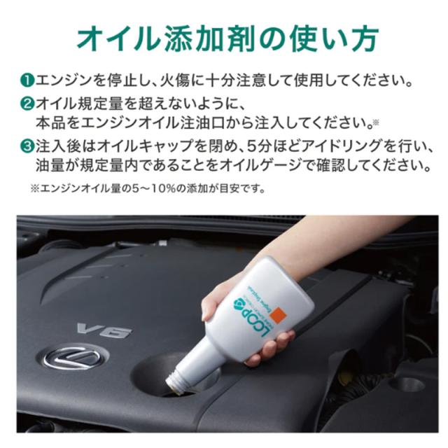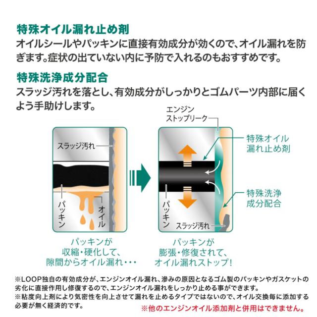 LOOP独自の有効成分が、エンジンオイル漏れ、滲みの原因となるゴム製のパッキンやガスケットの劣化した箇所に直接作用し修復することで、