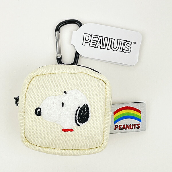 手のひらサイズの小さなポーチです。カラビナ付きなのでバッグにアクセサリー感覚で付けられます♪目を惹くワンカラーにふわふわのスヌーピーがカワイイ!!こちらはホワイトです。