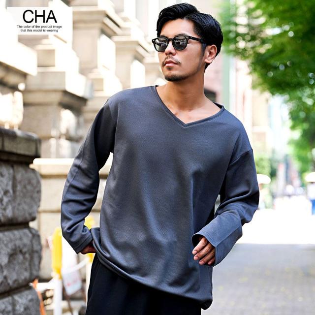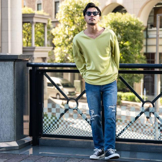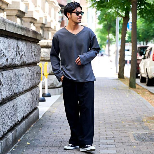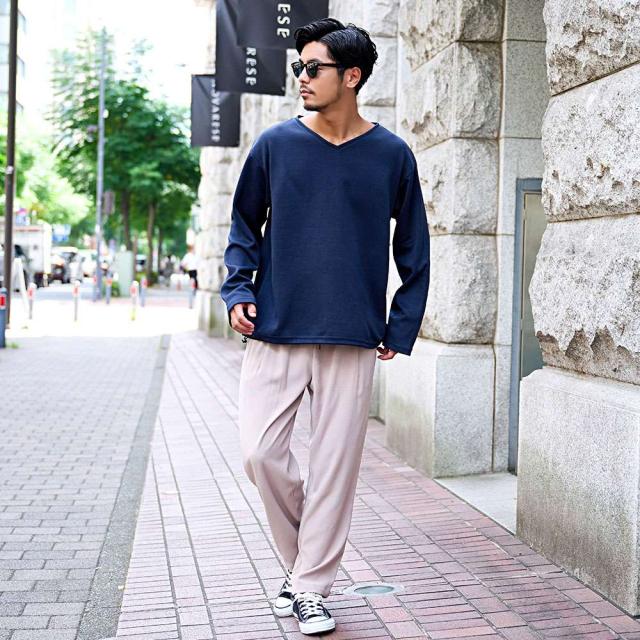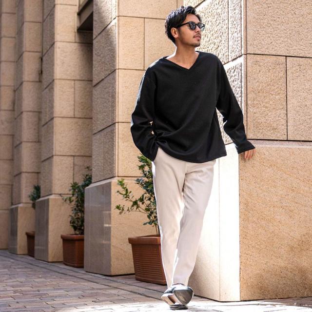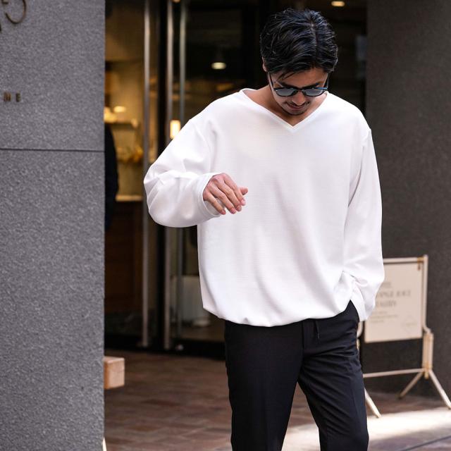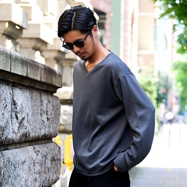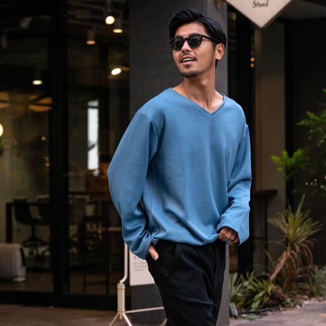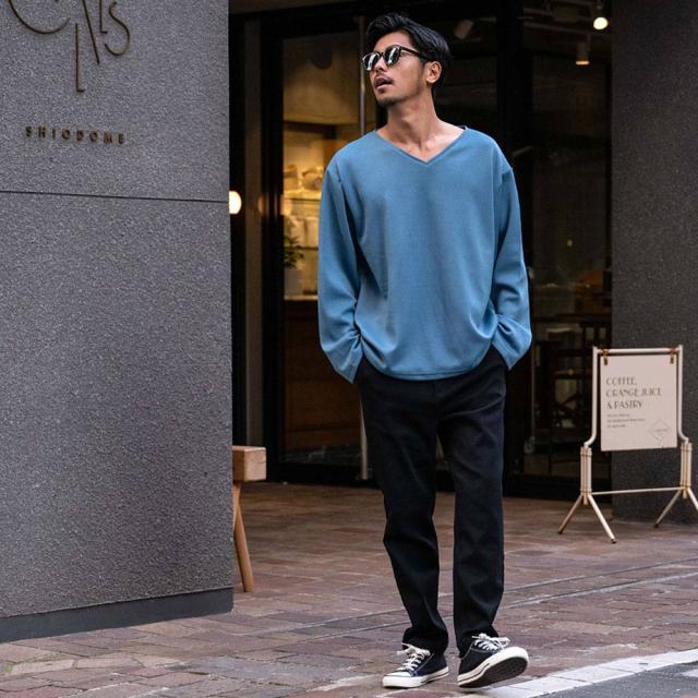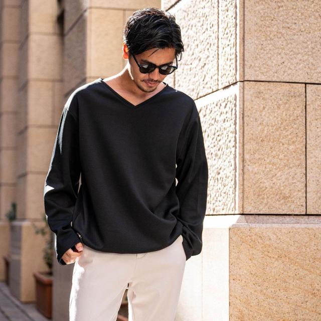 やや広めのVネックが顔周りをスッキリと見せ、リラックスした雰囲気をプラス。
