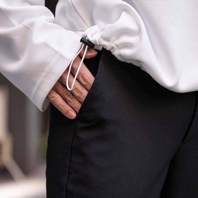 裾のドローコードを絞ることでタックインスタイルのような丸みのあるシルエットに変化をつけることも可能。