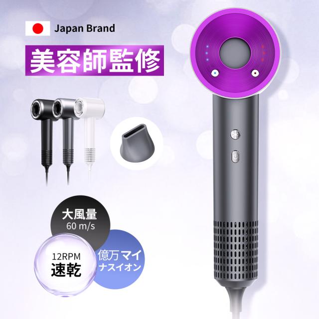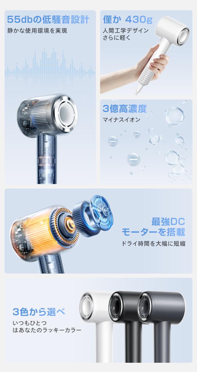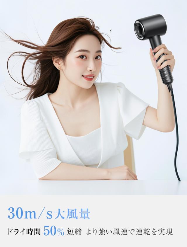 1400Wのパワフルな大風量で、パワフルなDCモーターを内蔵し、髪を根元から素早く乾かすことができます。120,000rpmの高速ブラシレスモーターを採用し、23m/s圧倒的な風速&2.6m?/分の大風量を実現。従来品より約70%のドライ時間を短縮し、最短1分間で速乾可能で、ドライ時の熱ダメージを回避できる髪に優しい 大風量 ドライヤー !