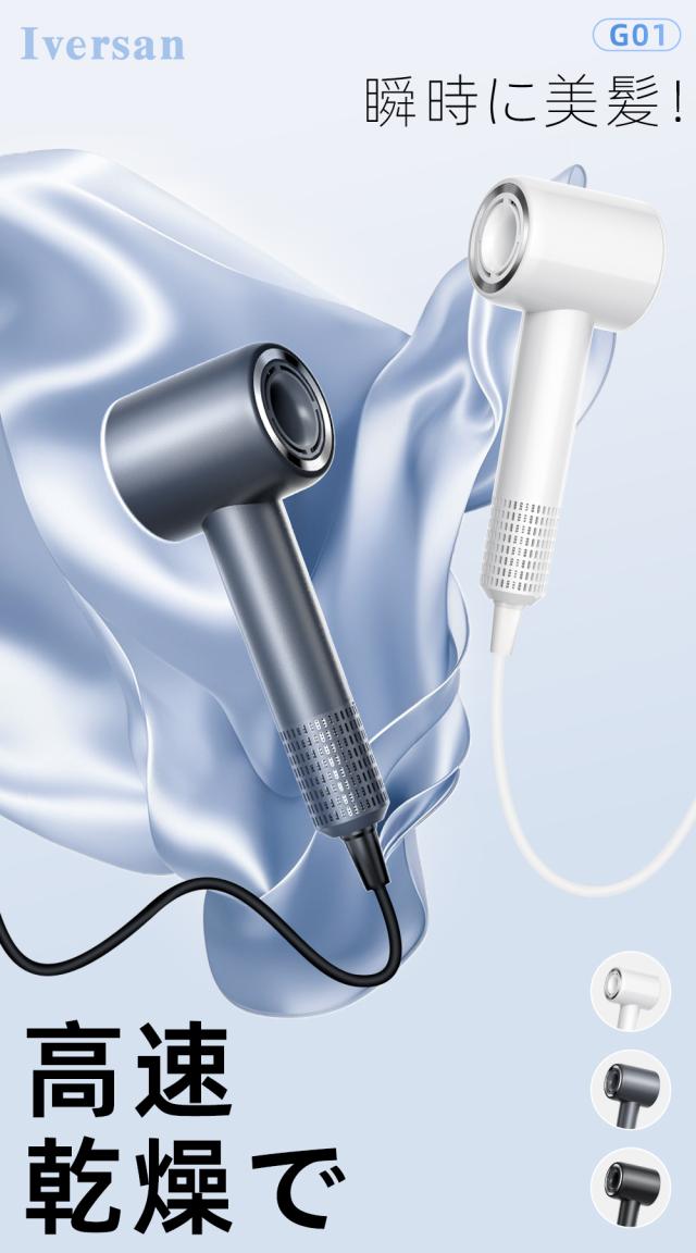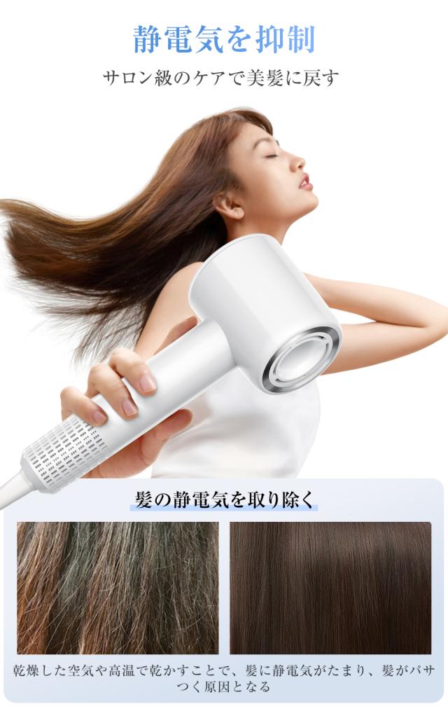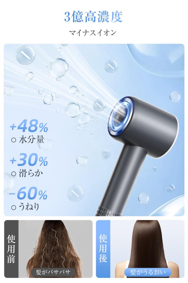 従来品の数十倍の2億もの高濃度マイナスイオンを放出します。髪のダメージをケアし、ツヤと潤いが戻るだけでなく、枝毛の改善も期待できます。Iversanヘアドライヤーは髪の保湿力を高め、速乾性を実現できる同時に、パワフルな風で髪に届け、表面をコーティングし、静電気を抑制。 髪の水分を保護し、マイナスイオンの力でキューティクルのダメージを修復します。静電気による+イオンが引き起こすクセ毛やうねりを中和し、髪に潤いを与えながら素早く乾かします。