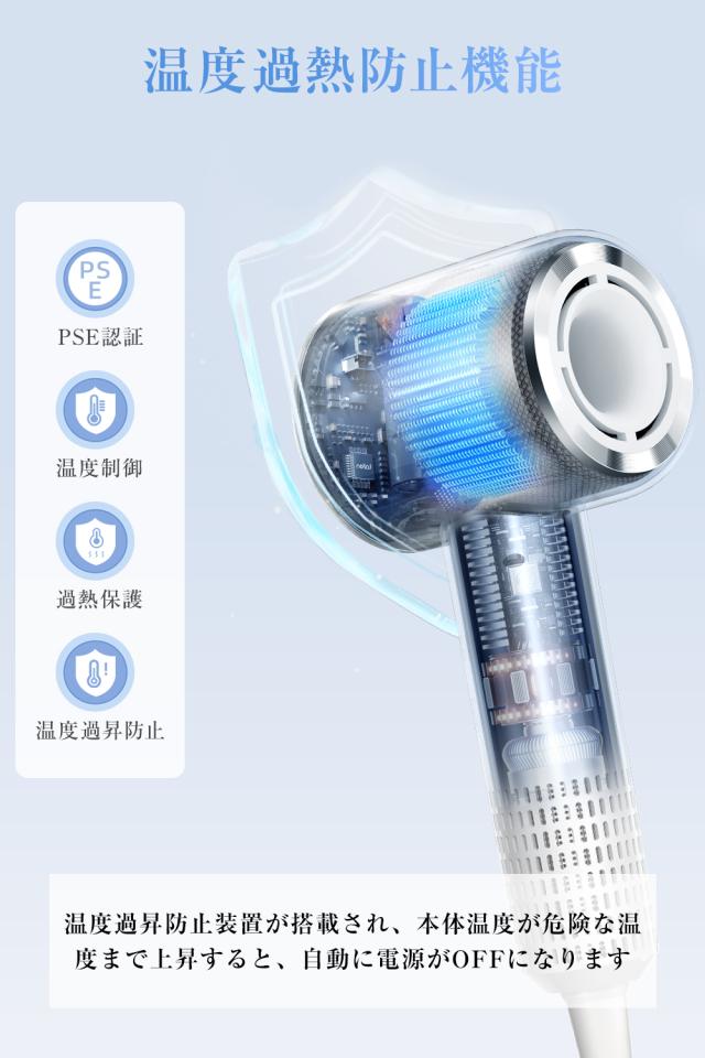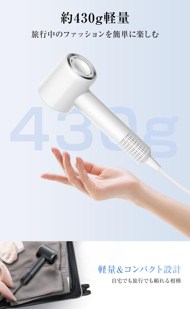 NTC温度検知チップとAI温度制御二重検知機能により、毎秒100回の温度検知を行います。過熱保護機能も搭載されており、本体が105°まで上昇すると自動的に電源を切れます。熱を溜めにくく、熱ダメージ抑えてソフトな風を毛先に届け、リアルタイムで風温をコントロールし温度過昇をを防ぎ、安全・安心にお使いいただけます。430gの軽量で長時間持っても疲れにくく、美容師にも好評です。