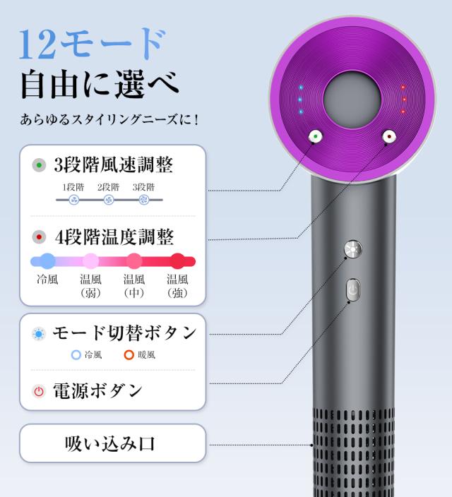 ドライヤー 大風量 高速ドライヤー 速乾 静音 1400W ヘアドライヤー マイナスイオン 3億個 低騒音 12モード 3段階温度調節 軽量 コンパクト 美髪 ヘアケア 髪質改善