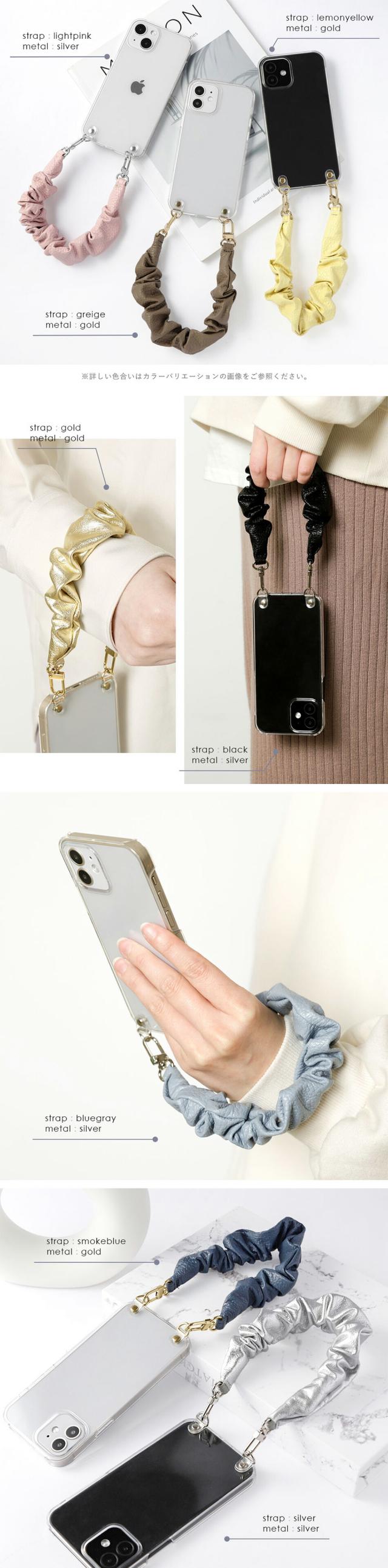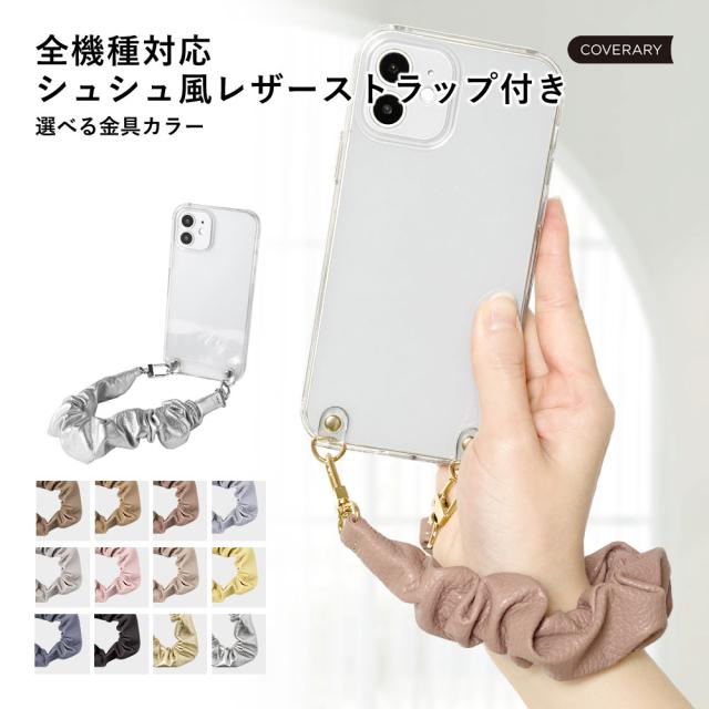 機種に合わせた専用クリアケースで操作スムーズ×シュシュ風レザーストラップ付き